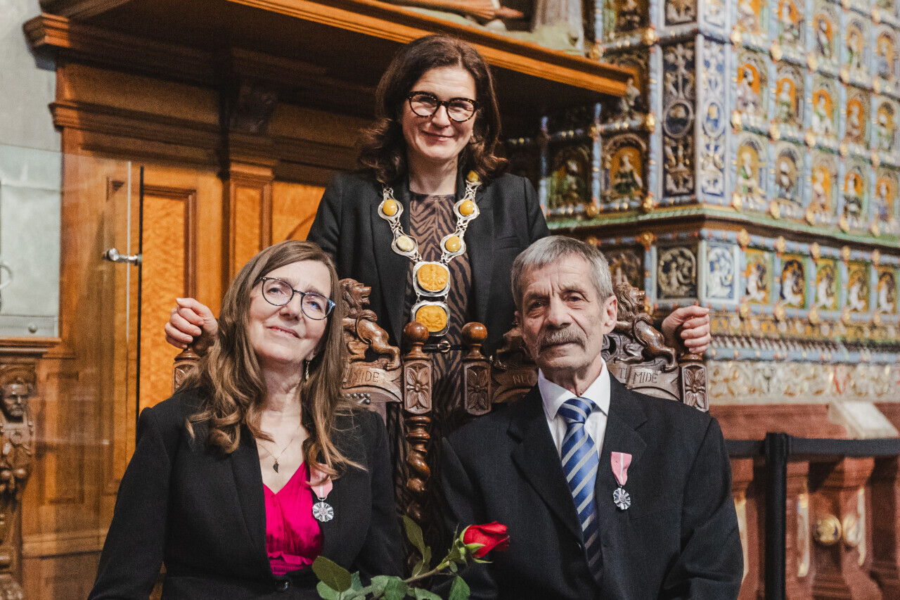 Gdańsk. Dwór Artusa. Jubileusz Par Małżeńskich - Złote Gody, podczas których Prezydent Gdańska Aleksandra Dulkiewicz wręczyła medale za długoletnie pożycie małżeńskie