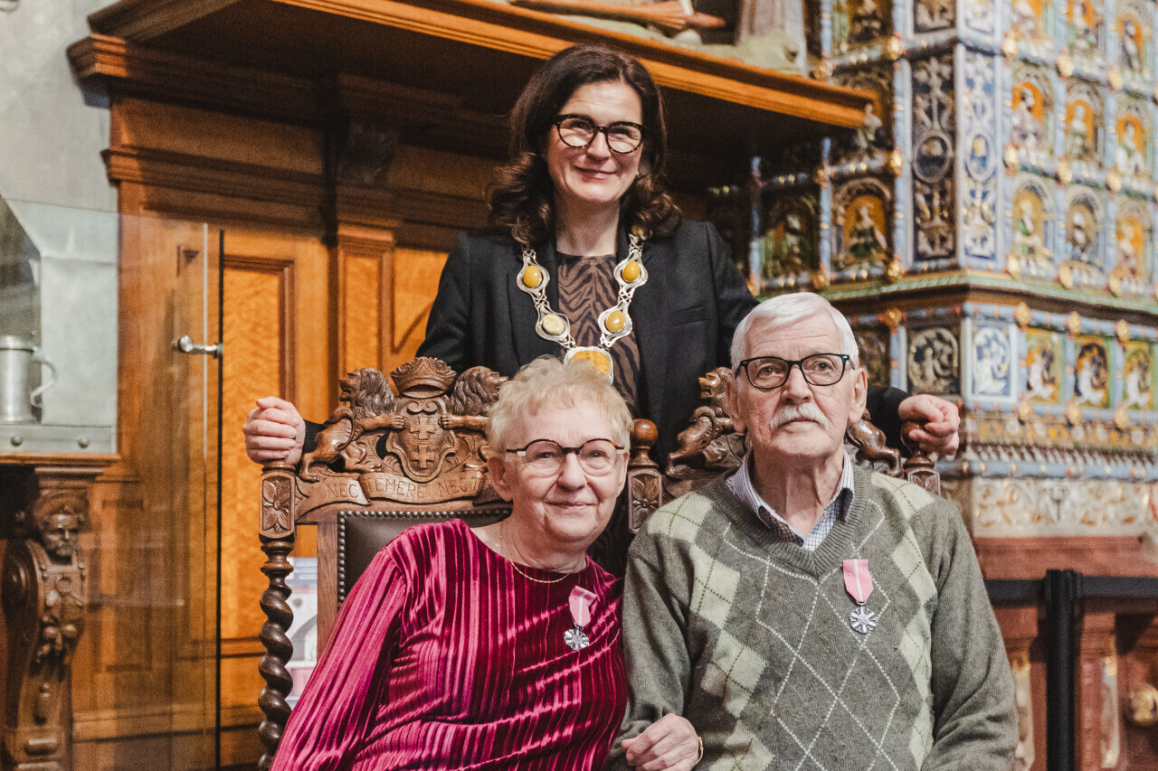 Gdańsk. Dwór Artusa. Jubileusz Par Małżeńskich - Złote Gody, podczas których Prezydent Gdańska Aleksandra Dulkiewicz wręczyła medale za długoletnie pożycie małżeńskie