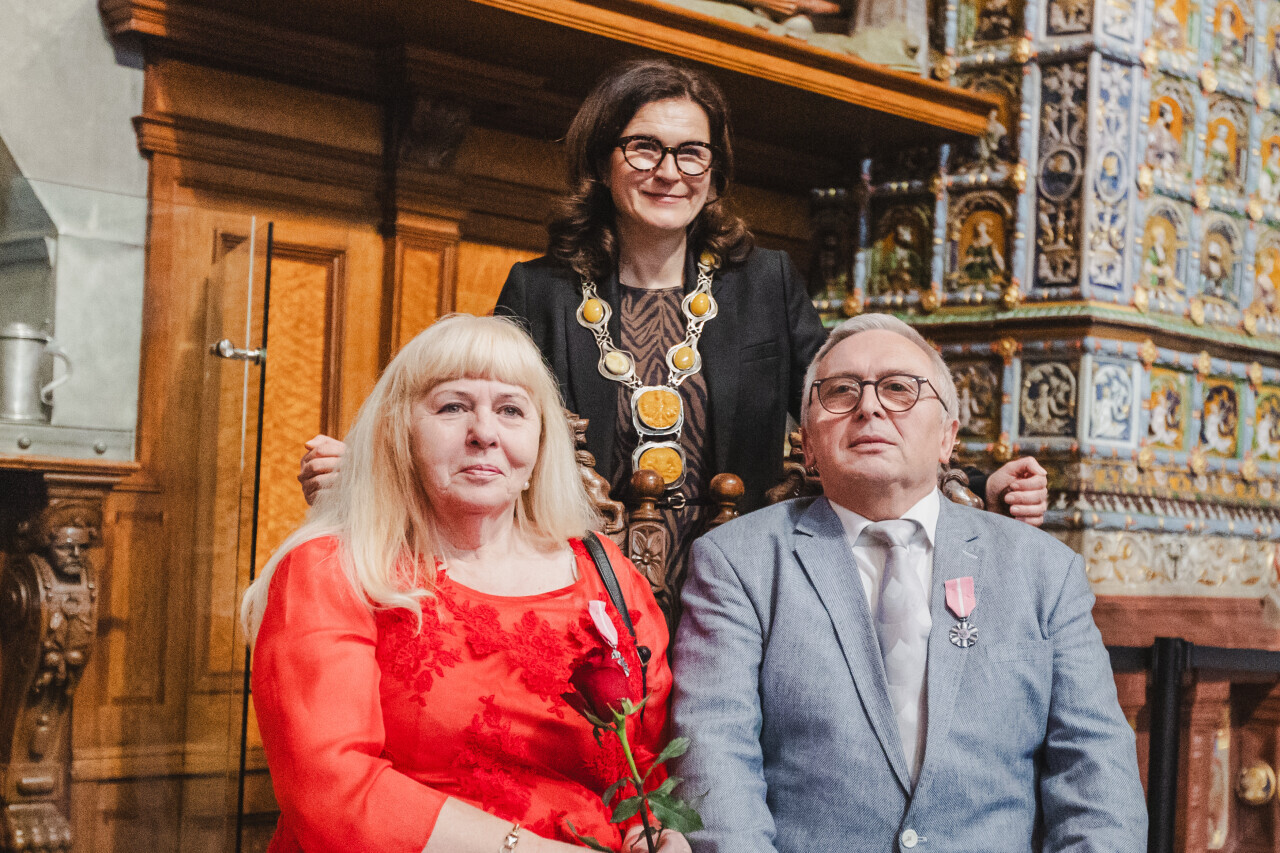 Gdańsk. Dwór Artusa. Jubileusz Par Małżeńskich - Złote Gody, podczas których Prezydent Gdańska Aleksandra Dulkiewicz wręczyła medale za długoletnie pożycie małżeńskie