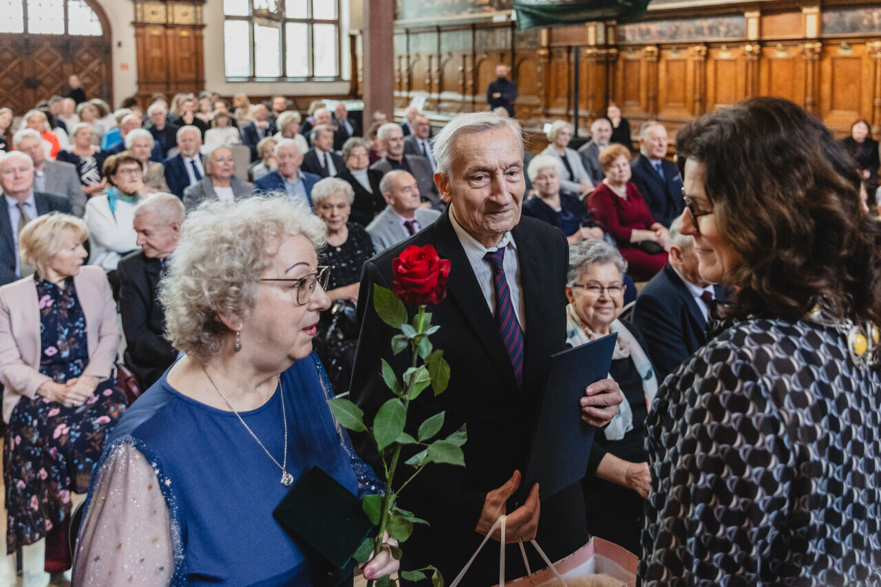 Gdańsk. Dwór Artusa. Jubileusz Par Małżeńskich - Złote Gody, podczas których Prezydent Gdańska Aleksandra Dulkiewicz wręczyła medale za długoletnie pożycie małżeńskie