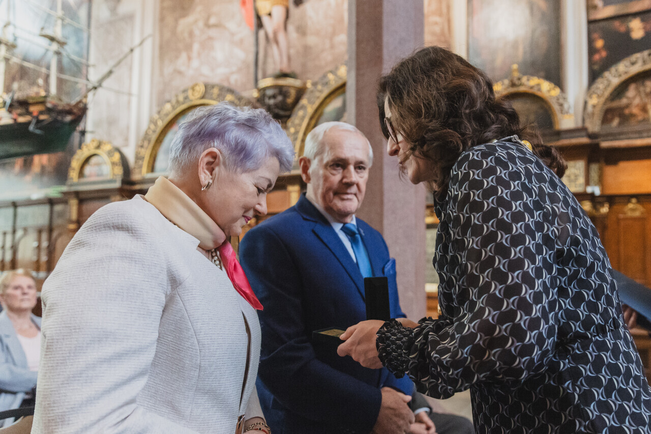 Gdańsk. Dwór Artusa. Jubileusz Par Małżeńskich - Złote Gody, podczas których Prezydent Gdańska Aleksandra Dulkiewicz wręczyła medale za długoletnie pożycie małżeńskie