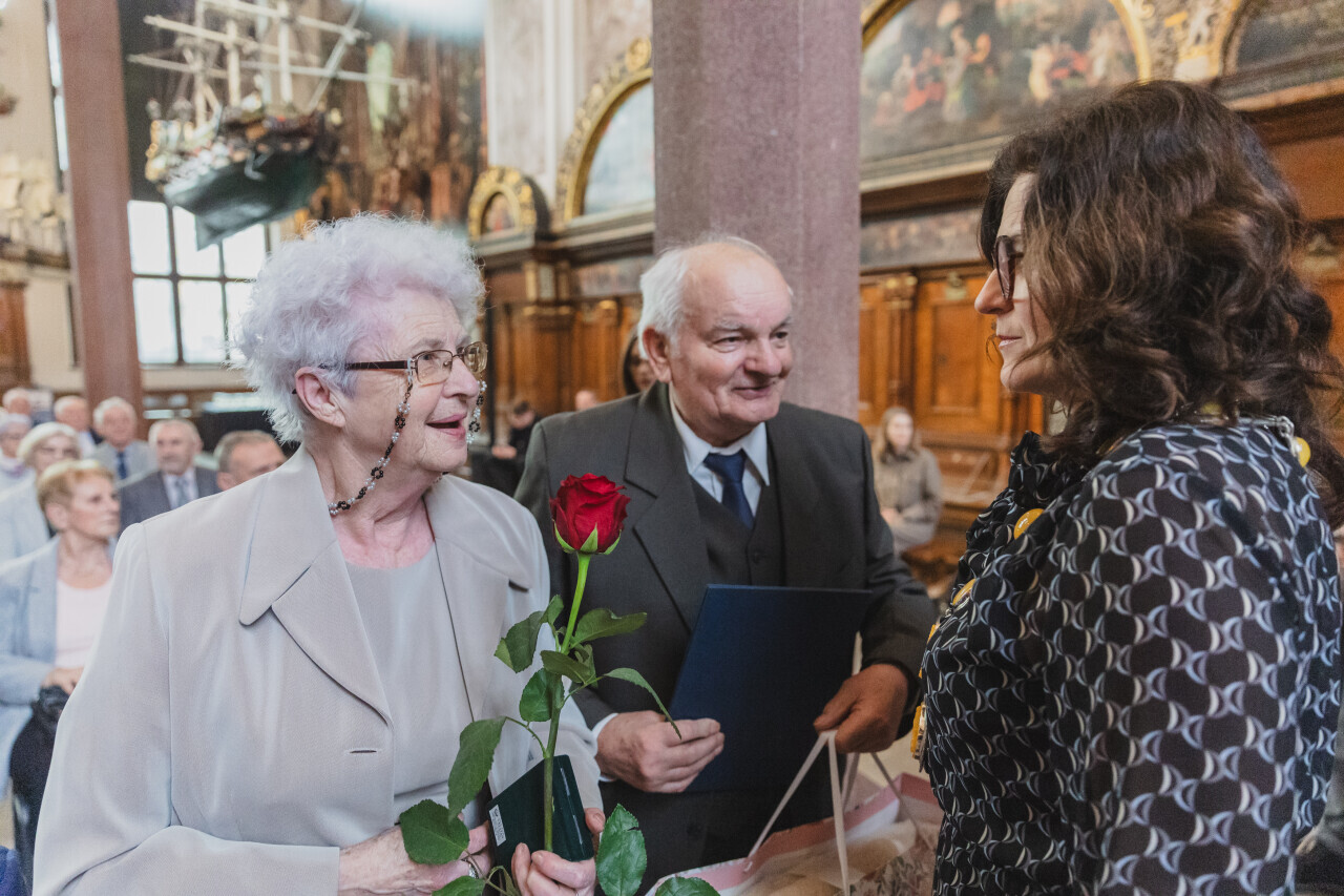 Gdańsk. Dwór Artusa. Jubileusz Par Małżeńskich - Złote Gody, podczas których Prezydent Gdańska Aleksandra Dulkiewicz wręczyła medale za długoletnie pożycie małżeńskie