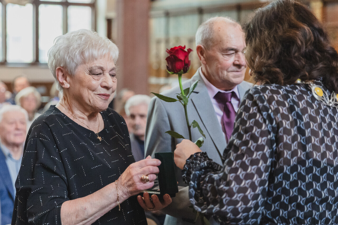 Gdańsk. Dwór Artusa. Jubileusz Par Małżeńskich - Złote Gody, podczas których Prezydent Gdańska Aleksandra Dulkiewicz wręczyła medale za długoletnie pożycie małżeńskie