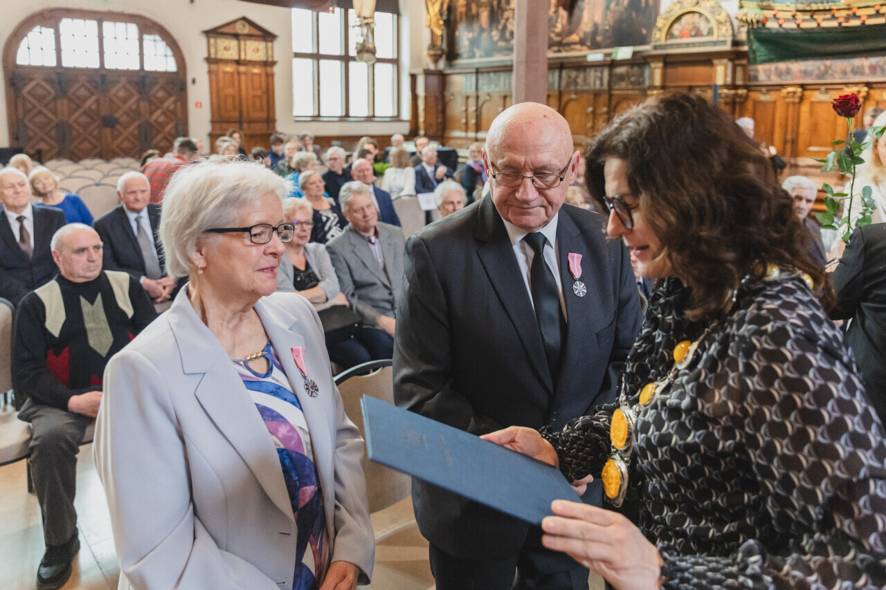 Gdańsk. Dwór Artusa. Jubileusz Par Małżeńskich - Złote Gody, podczas których Prezydent Gdańska Aleksandra Dulkiewicz wręczyła medale za długoletnie pożycie małżeńskie