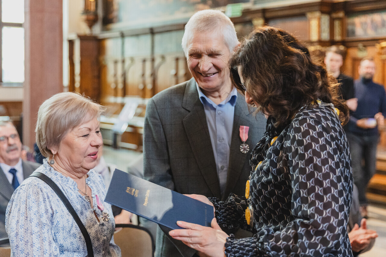 Gdańsk. Dwór Artusa. Jubileusz Par Małżeńskich - Złote Gody, podczas których Prezydent Gdańska Aleksandra Dulkiewicz wręczyła medale za długoletnie pożycie małżeńskie