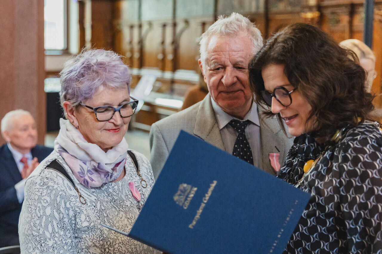 Gdańsk. Dwór Artusa. Jubileusz Par Małżeńskich - Złote Gody, podczas których Prezydent Gdańska Aleksandra Dulkiewicz wręczyła medale za długoletnie pożycie małżeńskie