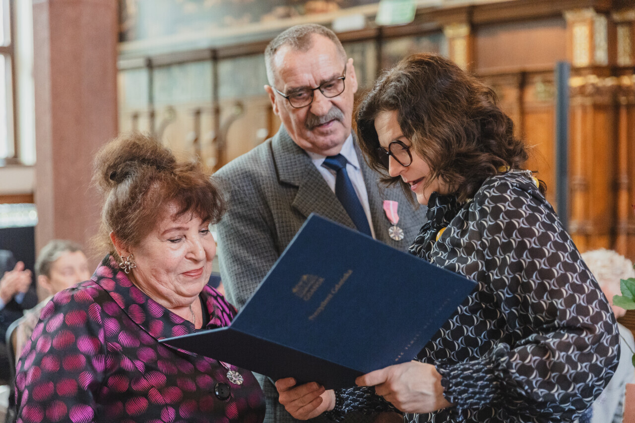 Gdańsk. Dwór Artusa. Jubileusz Par Małżeńskich - Złote Gody, podczas których Prezydent Gdańska Aleksandra Dulkiewicz wręczyła medale za długoletnie pożycie małżeńskie