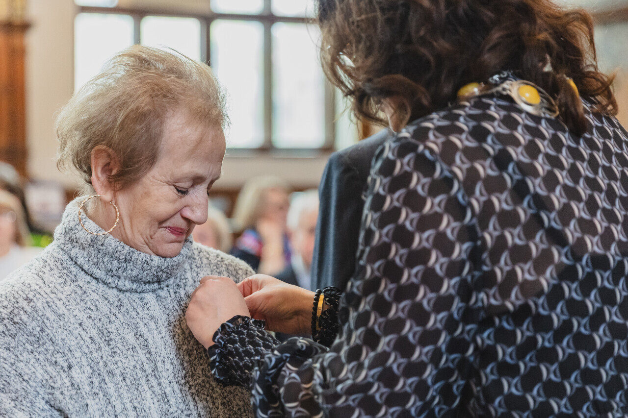 Gdańsk. Dwór Artusa. Jubileusz Par Małżeńskich - Złote Gody, podczas których Prezydent Gdańska Aleksandra Dulkiewicz wręczyła medale za długoletnie pożycie małżeńskie