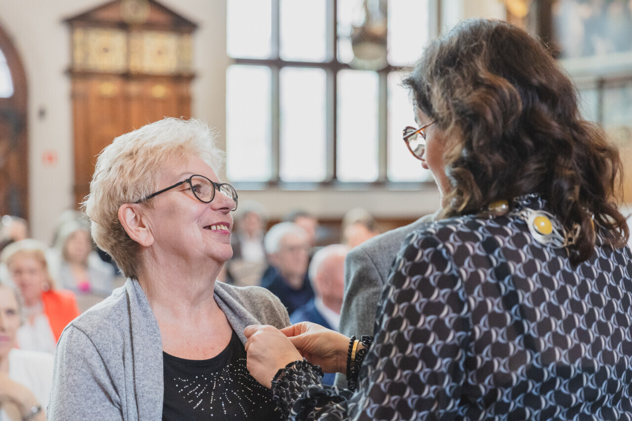 Gdańsk. Dwór Artusa. Jubileusz Par Małżeńskich - Złote Gody, podczas których Prezydent Gdańska Aleksandra Dulkiewicz wręczyła medale za długoletnie pożycie małżeńskie