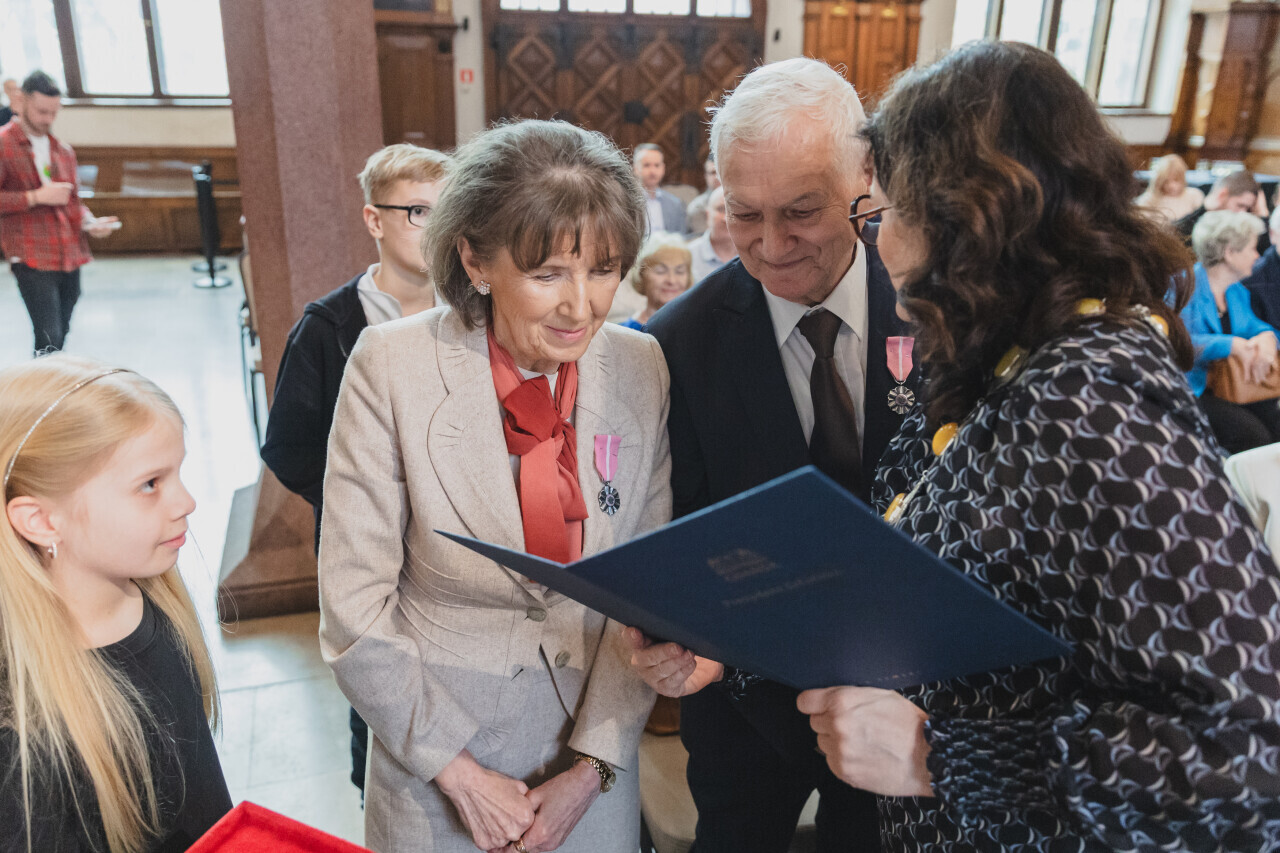 Gdańsk. Dwór Artusa. Jubileusz Par Małżeńskich - Złote Gody, podczas których Prezydent Gdańska Aleksandra Dulkiewicz wręczyła medale za długoletnie pożycie małżeńskie