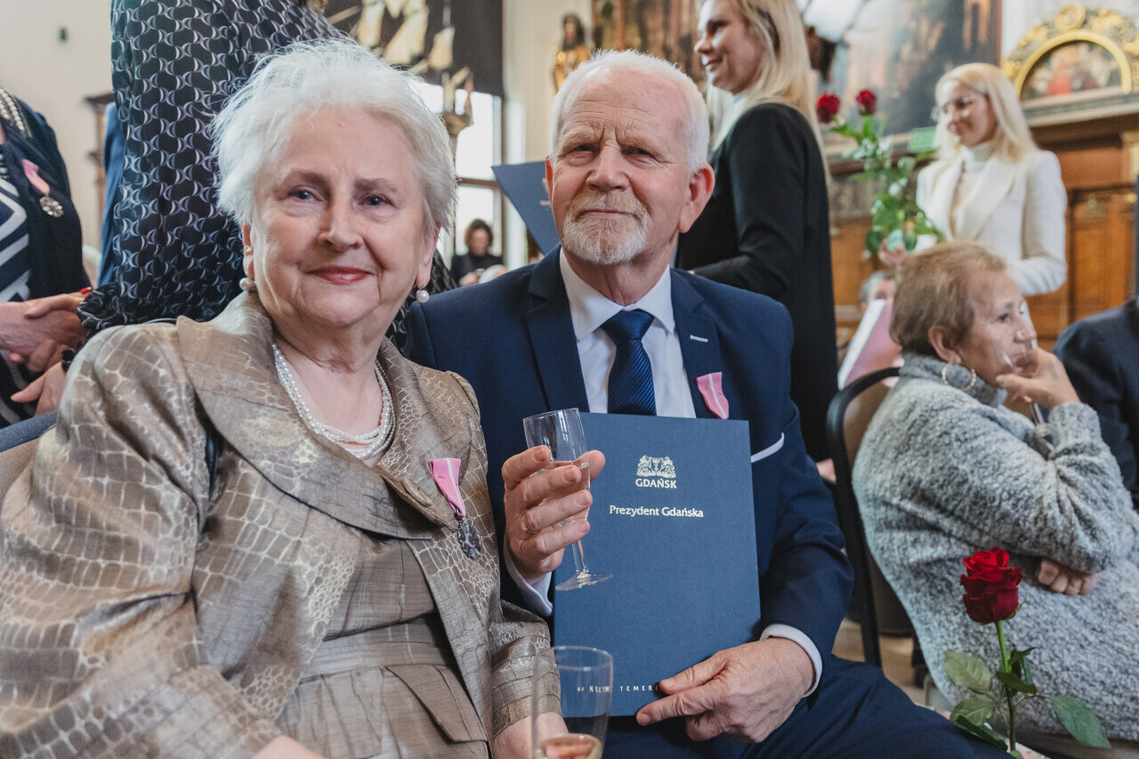 Gdańsk. Dwór Artusa. Jubileusz Par Małżeńskich - Złote Gody, podczas których Prezydent Gdańska Aleksandra Dulkiewicz wręczyła medale za długoletnie pożycie małżeńskie