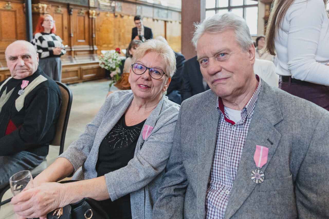 Gdańsk. Dwór Artusa. Jubileusz Par Małżeńskich - Złote Gody, podczas których Prezydent Gdańska Aleksandra Dulkiewicz wręczyła medale za długoletnie pożycie małżeńskie