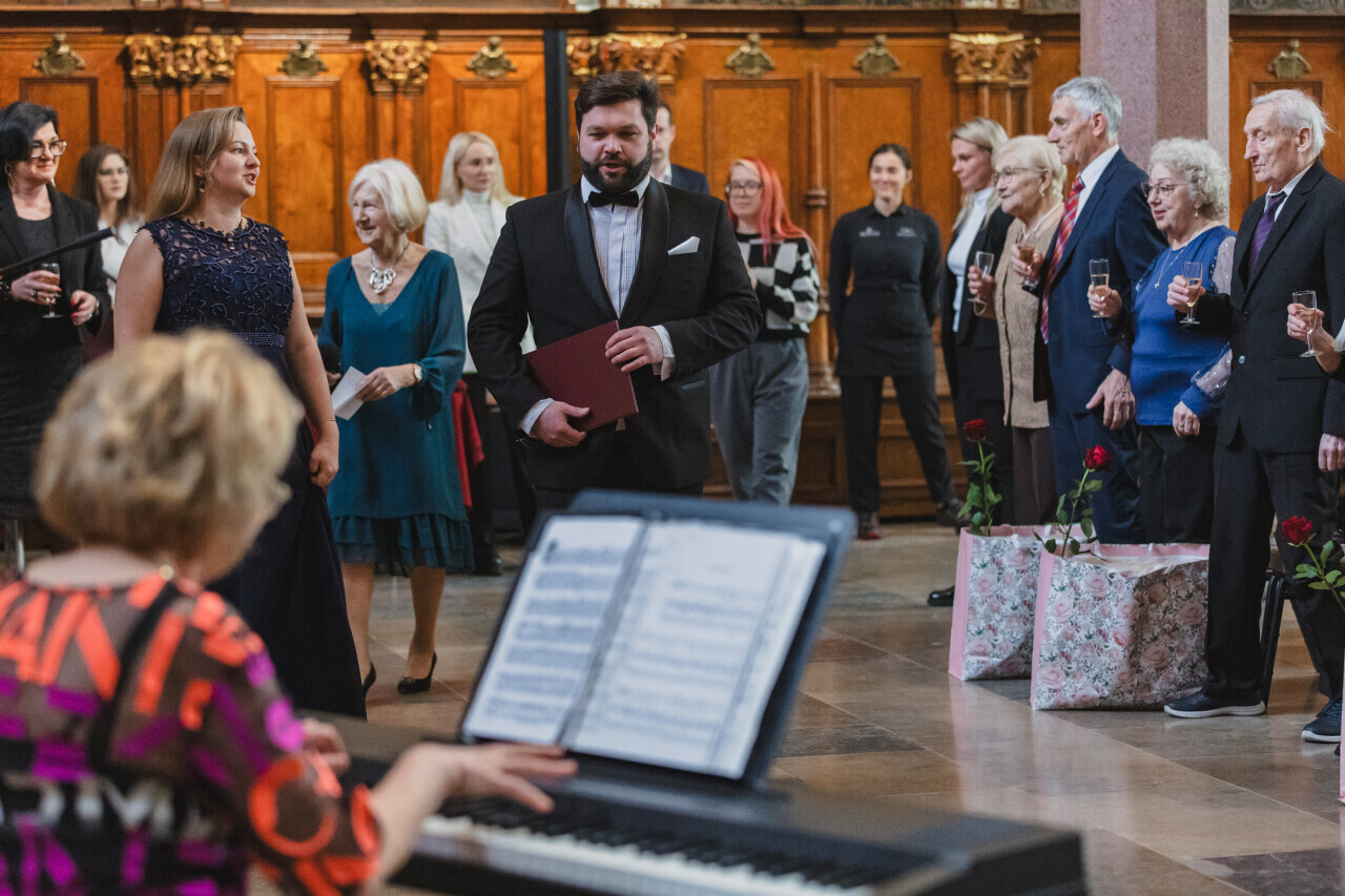 Gdańsk. Dwór Artusa. Jubileusz Par Małżeńskich - Złote Gody, podczas których Prezydent Gdańska Aleksandra Dulkiewicz wręczyła medale za długoletnie pożycie małżeńskie
