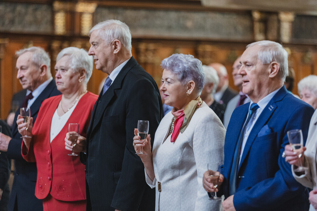 Gdańsk. Dwór Artusa. Jubileusz Par Małżeńskich - Złote Gody, podczas których Prezydent Gdańska Aleksandra Dulkiewicz wręczyła medale za długoletnie pożycie małżeńskie