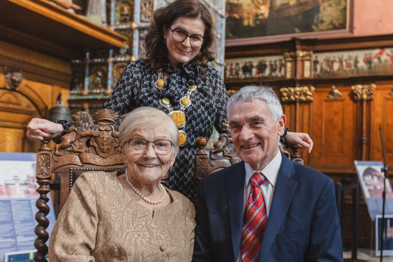 Gdańsk. Dwór Artusa. Jubileusz Par Małżeńskich - Złote Gody, podczas których Prezydent Gdańska Aleksandra Dulkiewicz wręczyła medale za długoletnie pożycie małżeńskie