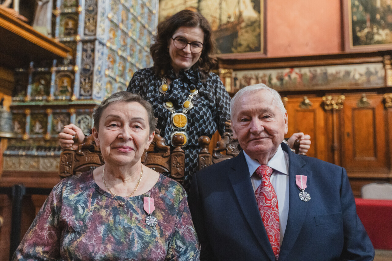 Gdańsk. Dwór Artusa. Jubileusz Par Małżeńskich - Złote Gody, podczas których Prezydent Gdańska Aleksandra Dulkiewicz wręczyła medale za długoletnie pożycie małżeńskie