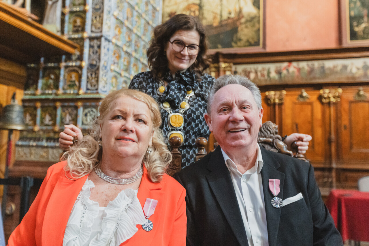 Gdańsk. Dwór Artusa. Jubileusz Par Małżeńskich - Złote Gody, podczas których Prezydent Gdańska Aleksandra Dulkiewicz wręczyła medale za długoletnie pożycie małżeńskie