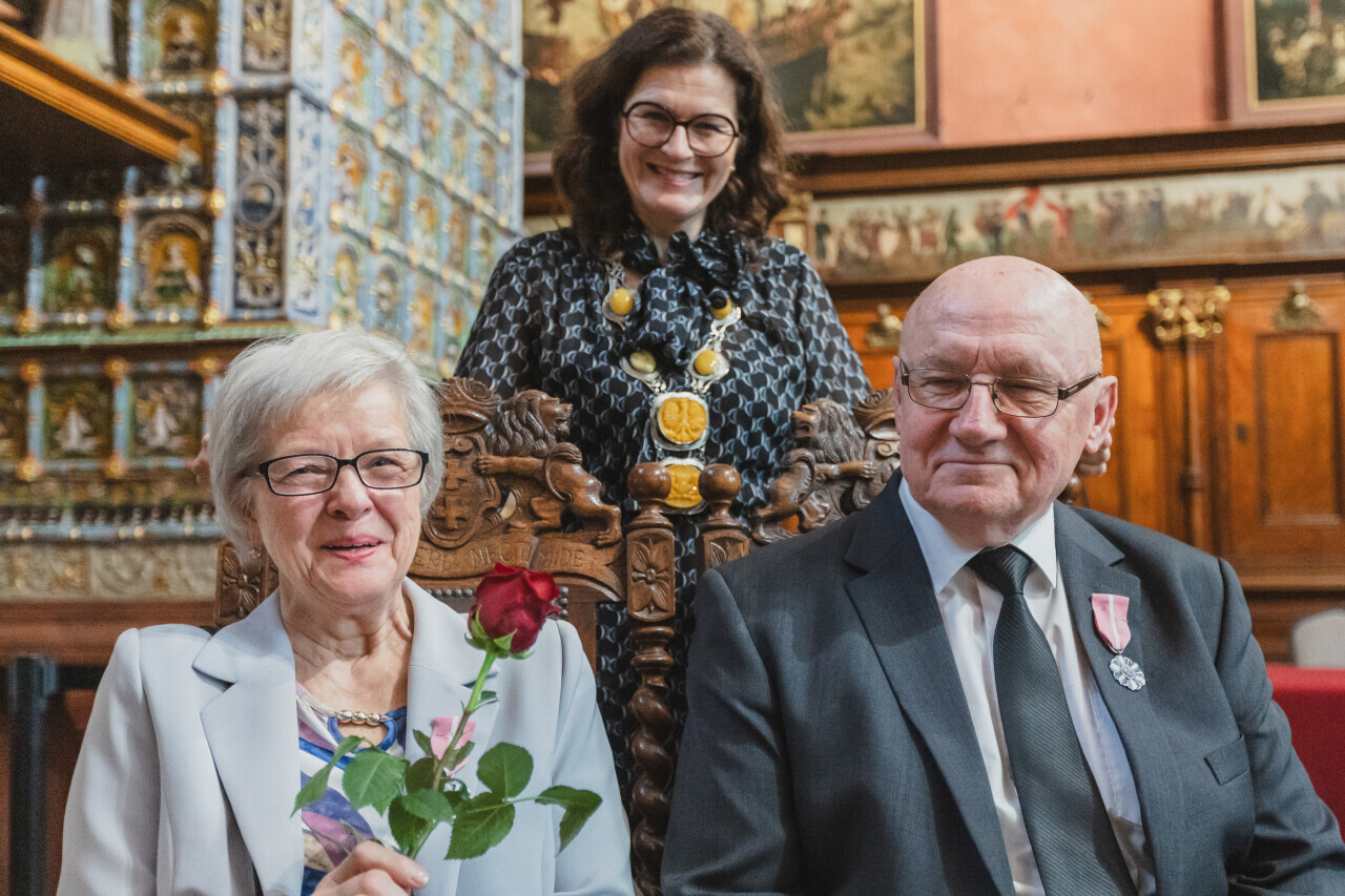 Gdańsk. Dwór Artusa. Jubileusz Par Małżeńskich - Złote Gody, podczas których Prezydent Gdańska Aleksandra Dulkiewicz wręczyła medale za długoletnie pożycie małżeńskie