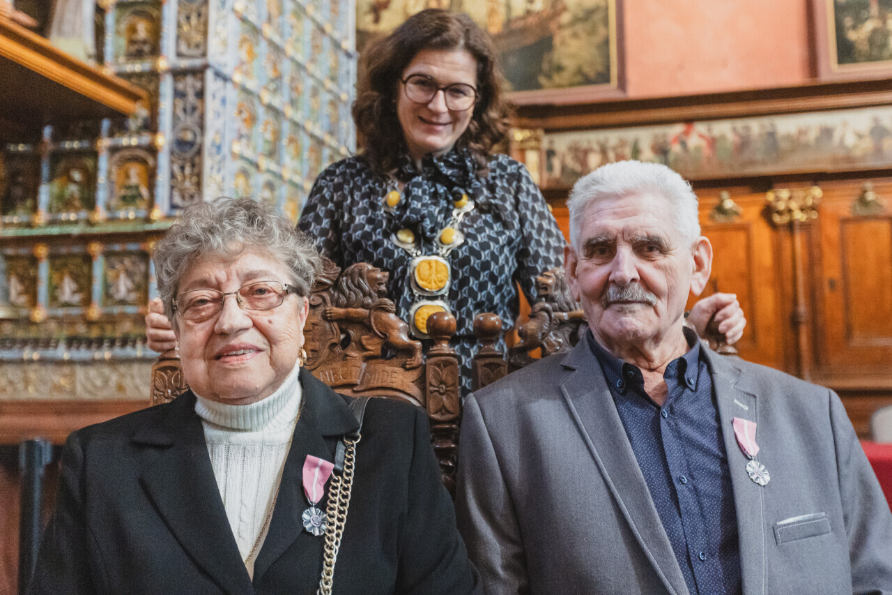 Gdańsk. Dwór Artusa. Jubileusz Par Małżeńskich - Złote Gody, podczas których Prezydent Gdańska Aleksandra Dulkiewicz wręczyła medale za długoletnie pożycie małżeńskie