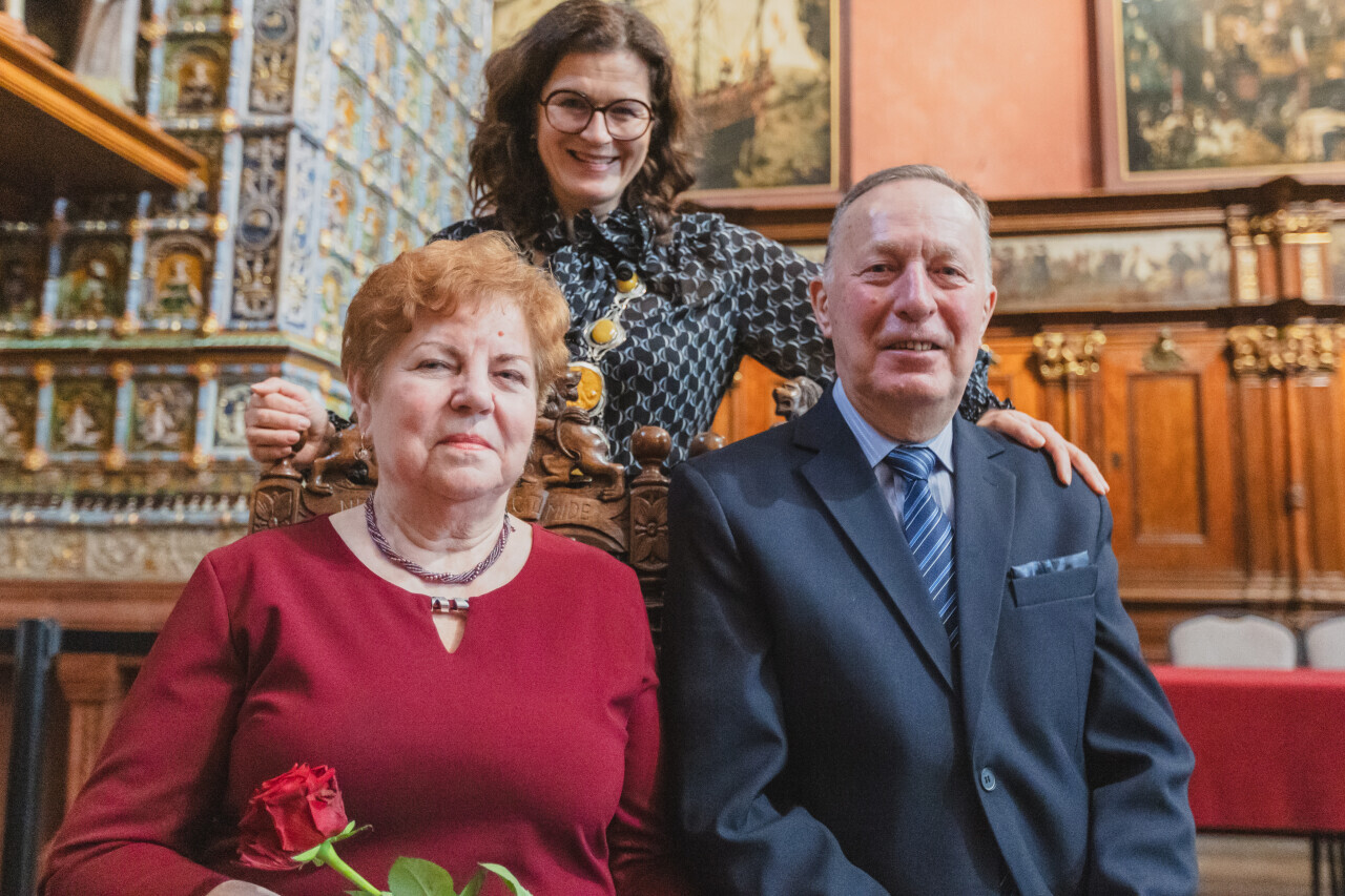 Gdańsk. Dwór Artusa. Jubileusz Par Małżeńskich - Złote Gody, podczas których Prezydent Gdańska Aleksandra Dulkiewicz wręczyła medale za długoletnie pożycie małżeńskie