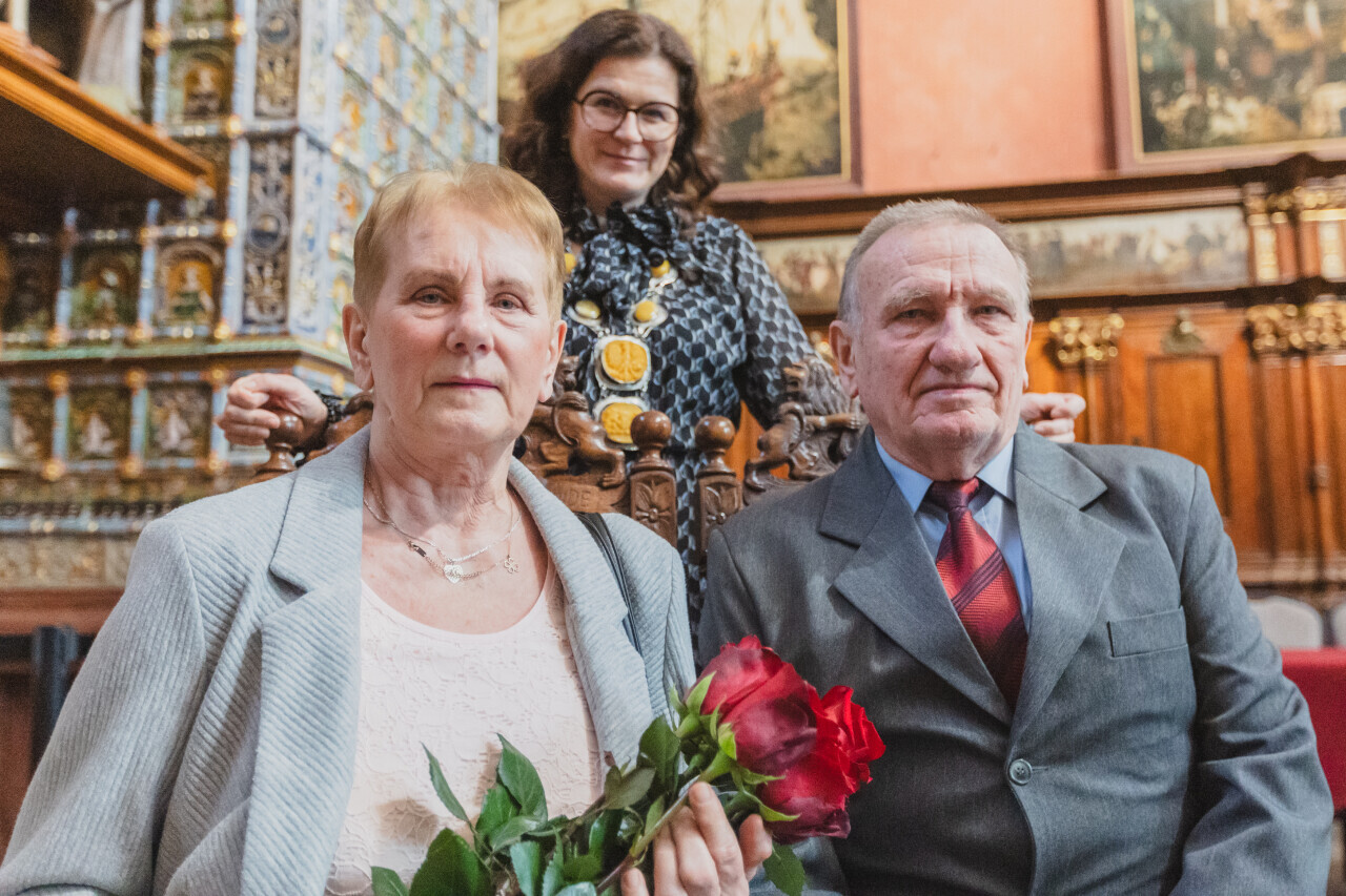 Gdańsk. Dwór Artusa. Jubileusz Par Małżeńskich - Złote Gody, podczas których Prezydent Gdańska Aleksandra Dulkiewicz wręczyła medale za długoletnie pożycie małżeńskie