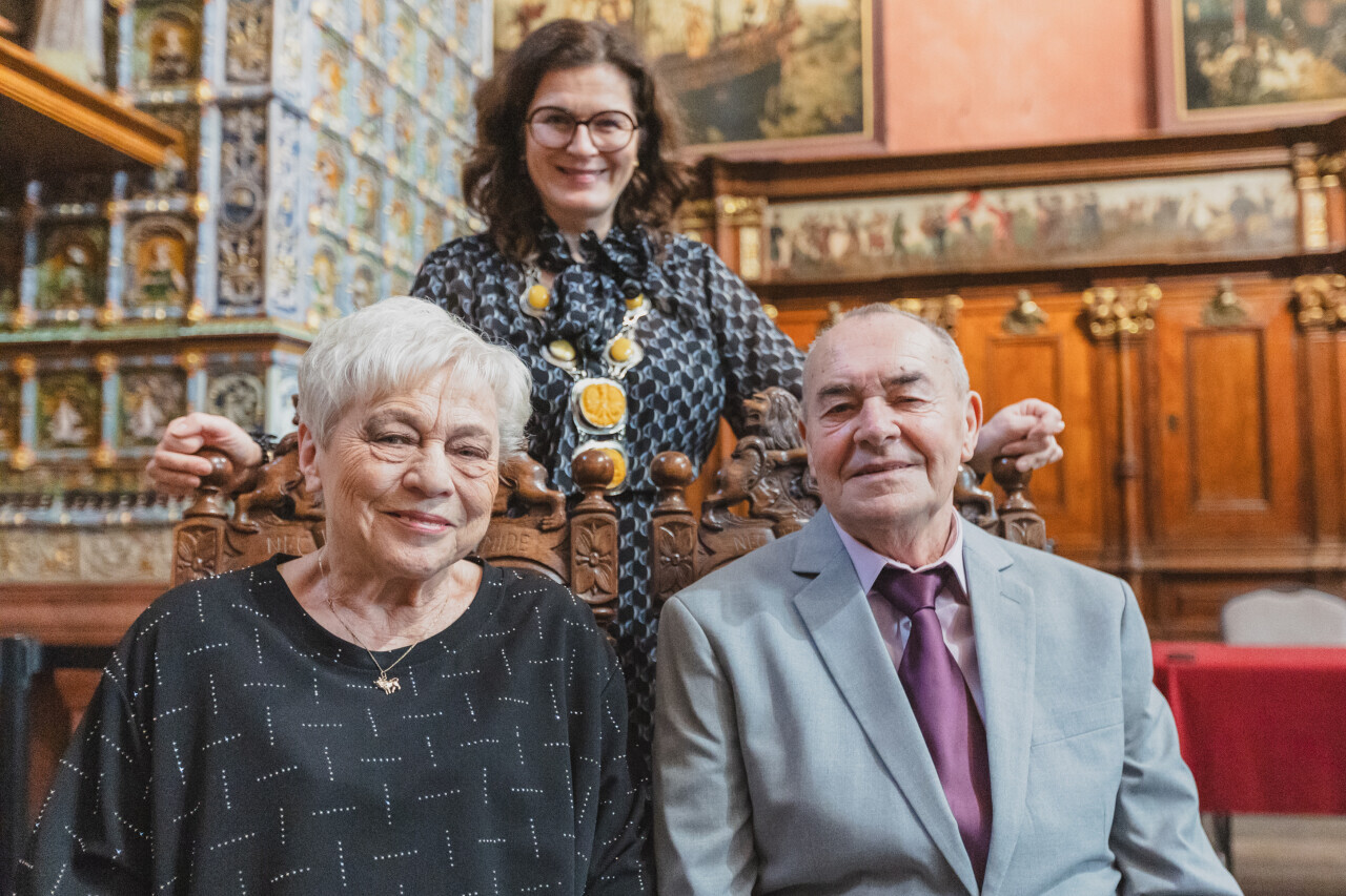 Gdańsk. Dwór Artusa. Jubileusz Par Małżeńskich - Złote Gody, podczas których Prezydent Gdańska Aleksandra Dulkiewicz wręczyła medale za długoletnie pożycie małżeńskie