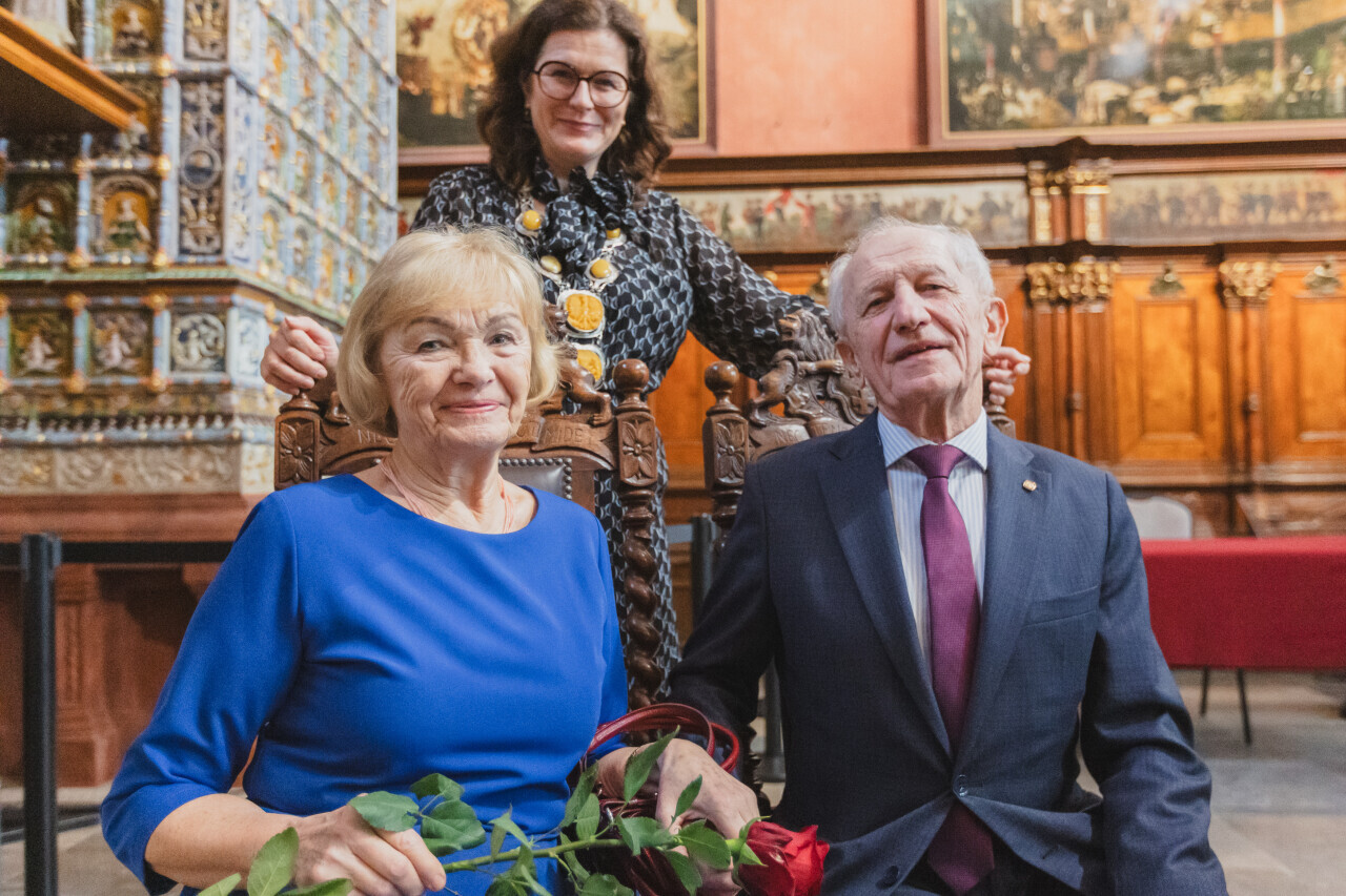 Gdańsk. Dwór Artusa. Jubileusz Par Małżeńskich - Złote Gody, podczas których Prezydent Gdańska Aleksandra Dulkiewicz wręczyła medale za długoletnie pożycie małżeńskie