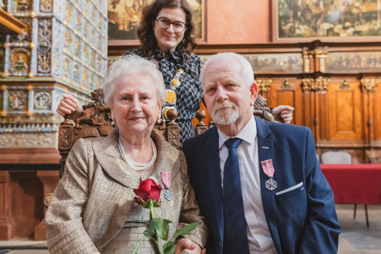 Gdańsk. Dwór Artusa. Jubileusz Par Małżeńskich - Złote Gody, podczas których Prezydent Gdańska Aleksandra Dulkiewicz wręczyła medale za długoletnie pożycie małżeńskie