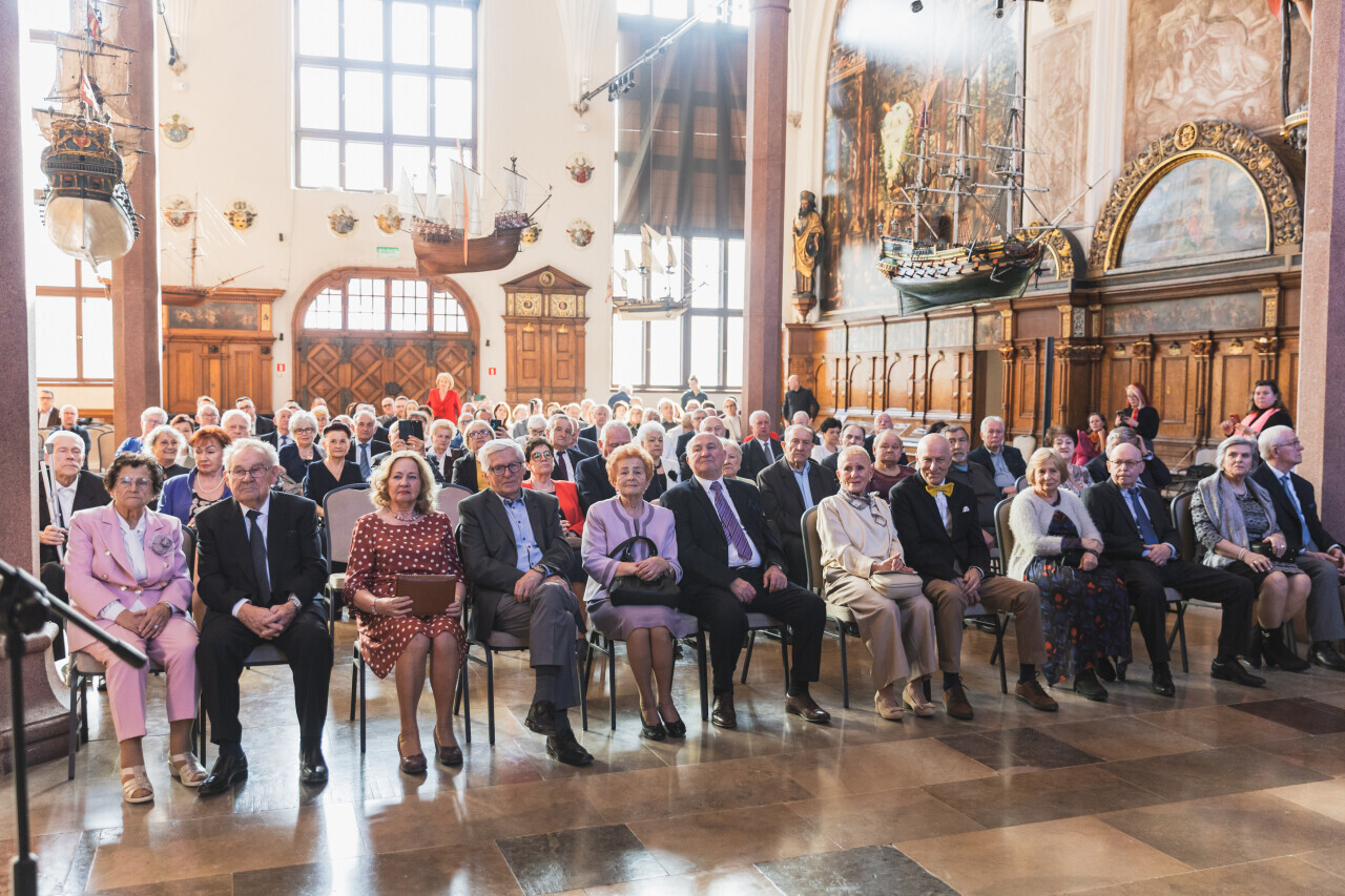 Gdańsk. Dwór Artusa. Jubileusz Par Małżeńskich - Złote Gody, podczas których Prezydent Gdańska Aleksandra Dulkiewicz wręczyła medale za długoletnie pożycie małżeńskie