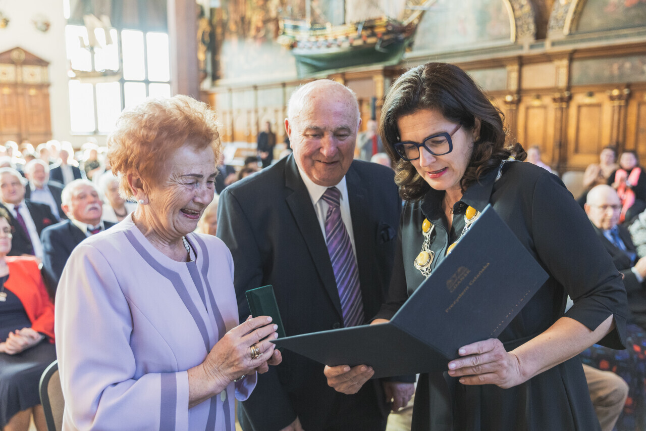 Gdańsk. Dwór Artusa. Jubileusz Par Małżeńskich - Złote Gody, podczas których Prezydent Gdańska Aleksandra Dulkiewicz wręczyła medale za długoletnie pożycie małżeńskie