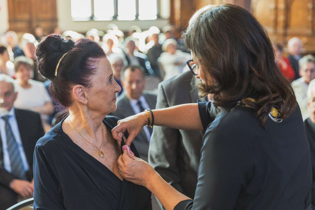 Gdańsk. Dwór Artusa. Jubileusz Par Małżeńskich - Złote Gody, podczas których Prezydent Gdańska Aleksandra Dulkiewicz wręczyła medale za długoletnie pożycie małżeńskie