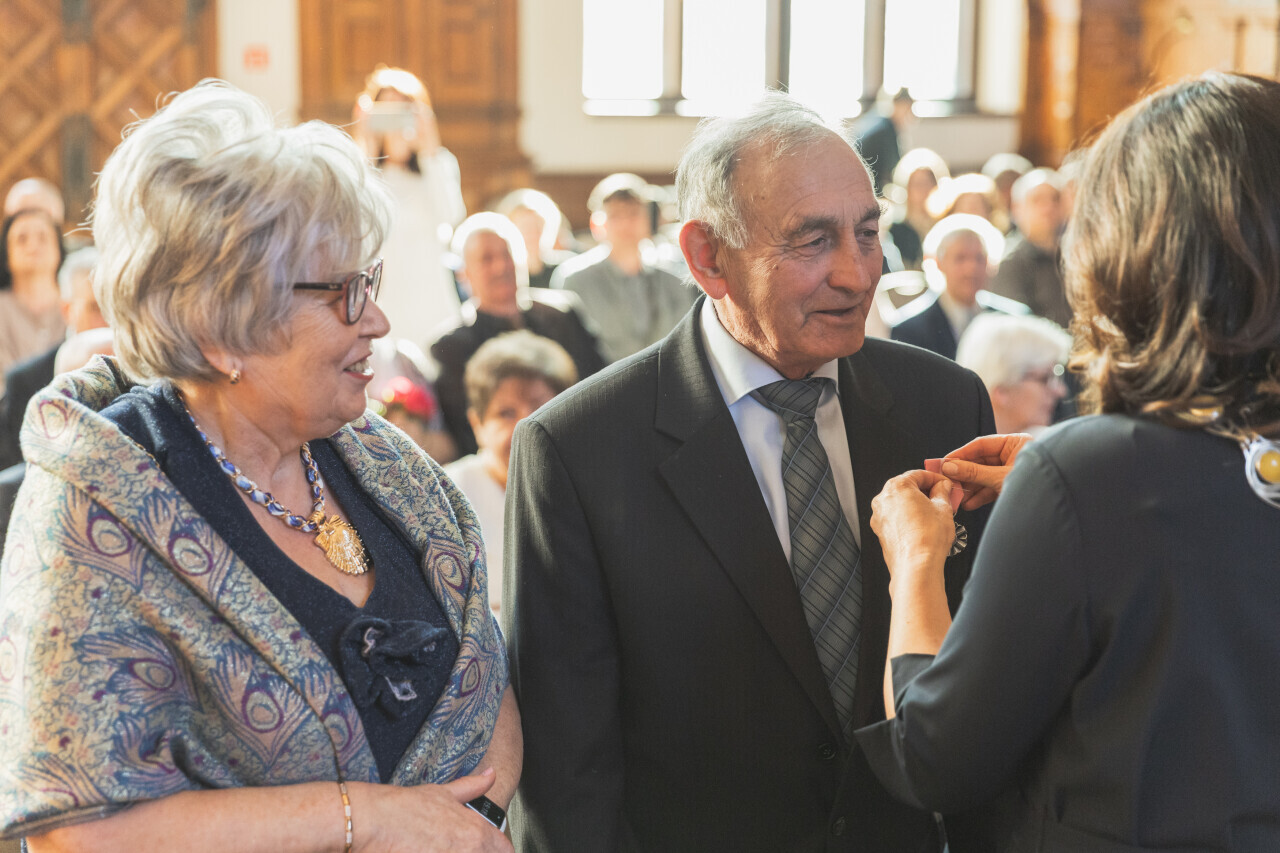 Gdańsk. Dwór Artusa. Jubileusz Par Małżeńskich - Złote Gody, podczas których Prezydent Gdańska Aleksandra Dulkiewicz wręczyła medale za długoletnie pożycie małżeńskie
