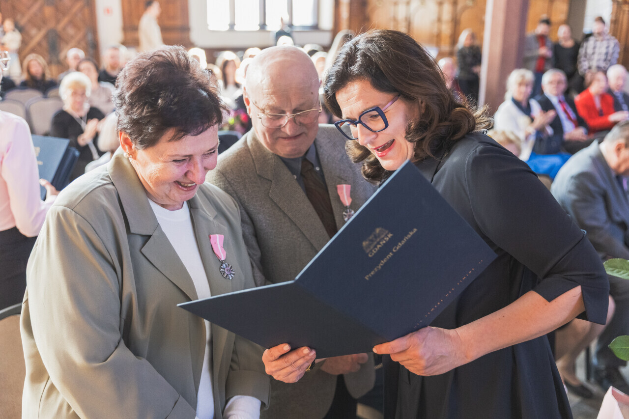 Gdańsk. Dwór Artusa. Jubileusz Par Małżeńskich - Złote Gody, podczas których Prezydent Gdańska Aleksandra Dulkiewicz wręczyła medale za długoletnie pożycie małżeńskie