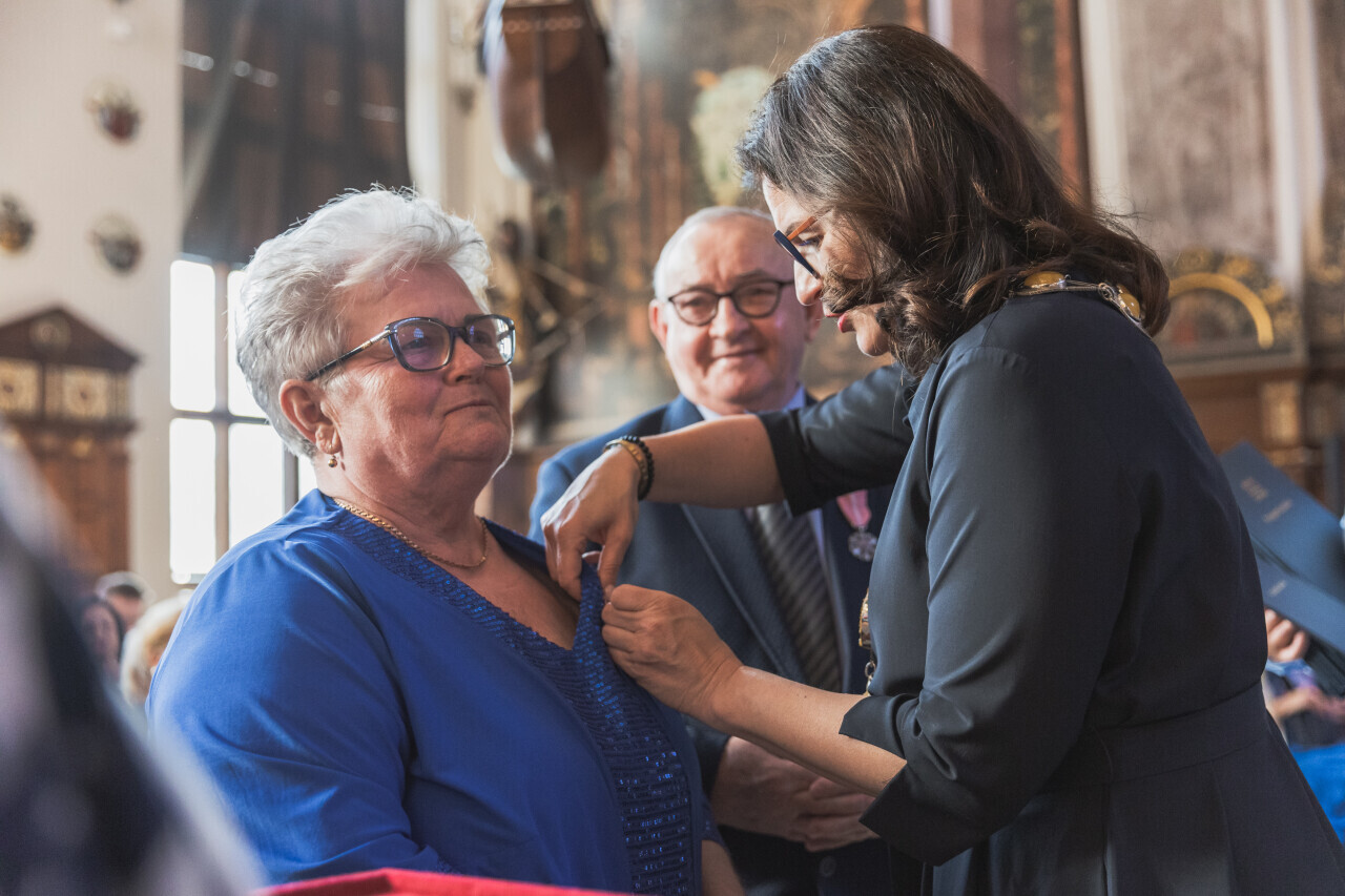 Gdańsk. Dwór Artusa. Jubileusz Par Małżeńskich - Złote Gody, podczas których Prezydent Gdańska Aleksandra Dulkiewicz wręczyła medale za długoletnie pożycie małżeńskie