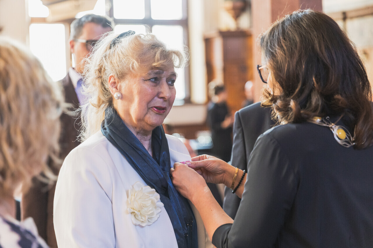 Gdańsk. Dwór Artusa. Jubileusz Par Małżeńskich - Złote Gody, podczas których Prezydent Gdańska Aleksandra Dulkiewicz wręczyła medale za długoletnie pożycie małżeńskie