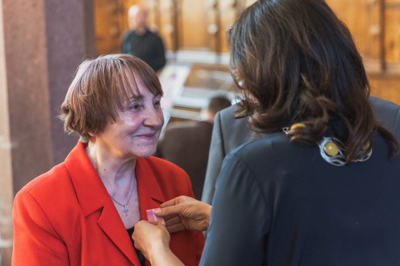 Gdańsk. Dwór Artusa. Jubileusz Par Małżeńskich - Złote Gody, podczas których Prezydent Gdańska Aleksandra Dulkiewicz wręczyła medale za długoletnie pożycie małżeńskie
