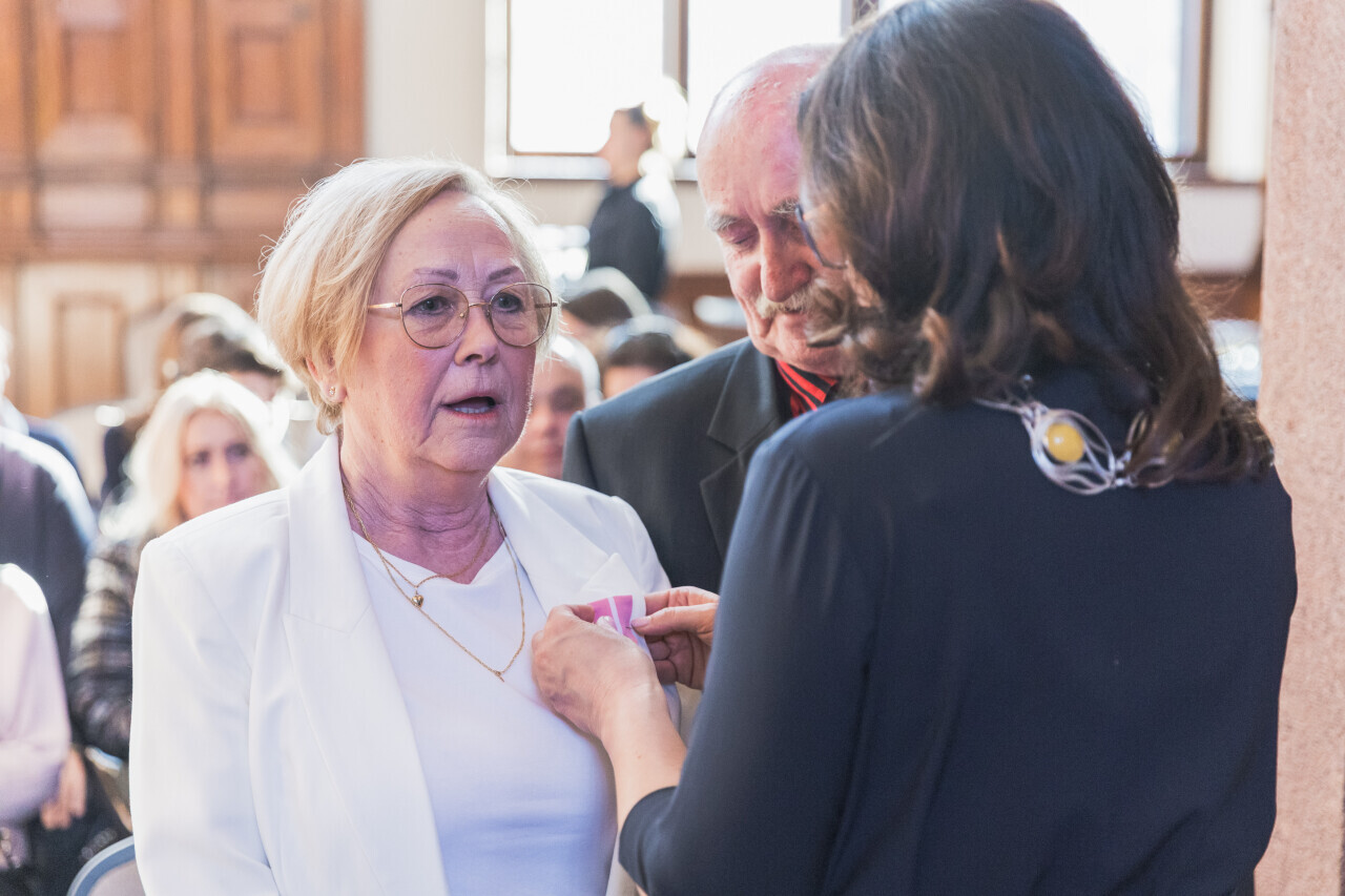 Gdańsk. Dwór Artusa. Jubileusz Par Małżeńskich - Złote Gody, podczas których Prezydent Gdańska Aleksandra Dulkiewicz wręczyła medale za długoletnie pożycie małżeńskie