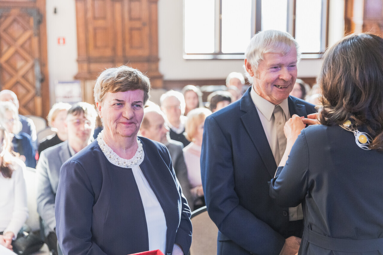 Gdańsk. Dwór Artusa. Jubileusz Par Małżeńskich - Złote Gody, podczas których Prezydent Gdańska Aleksandra Dulkiewicz wręczyła medale za długoletnie pożycie małżeńskie