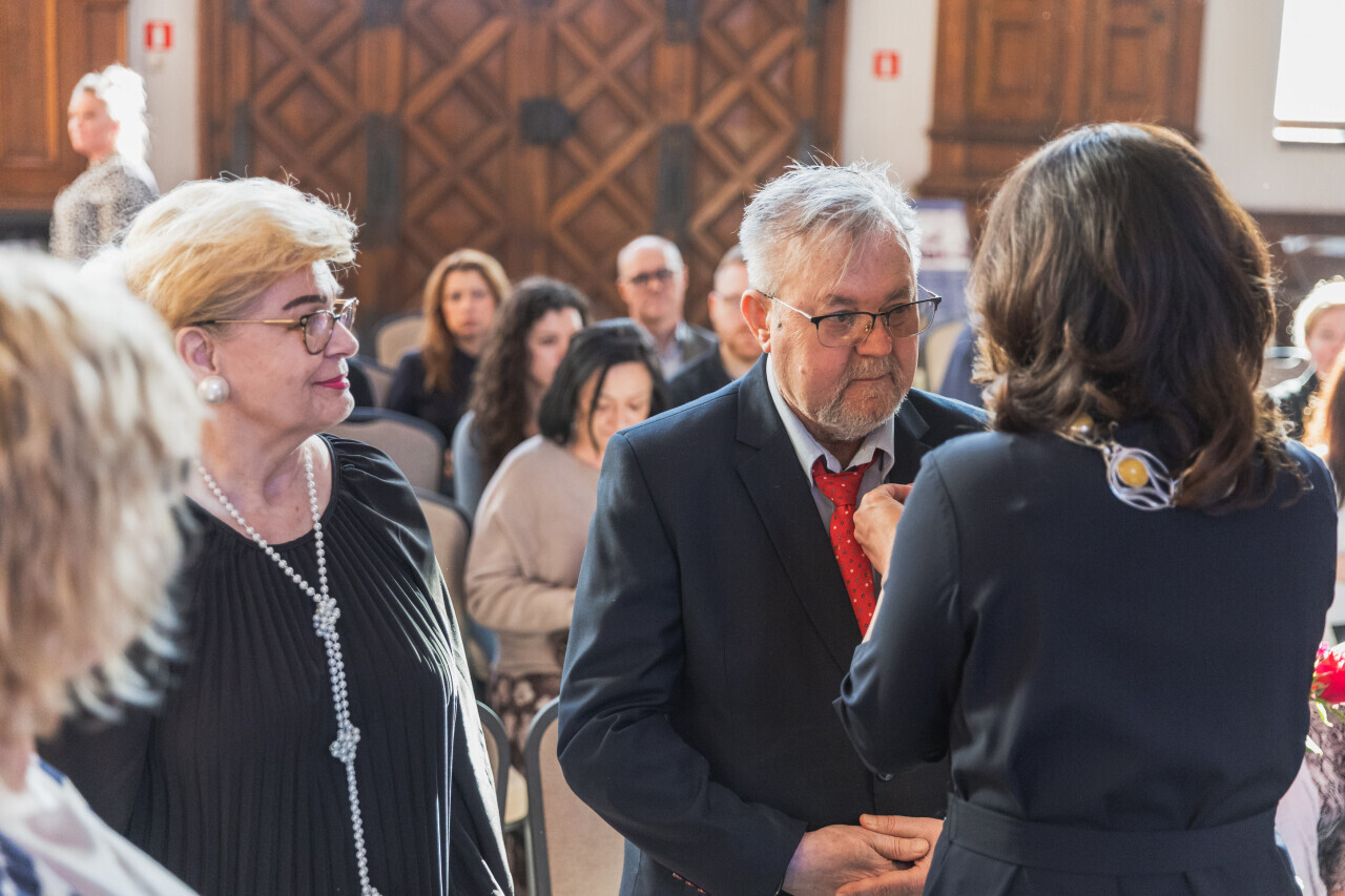 Gdańsk. Dwór Artusa. Jubileusz Par Małżeńskich - Złote Gody, podczas których Prezydent Gdańska Aleksandra Dulkiewicz wręczyła medale za długoletnie pożycie małżeńskie
