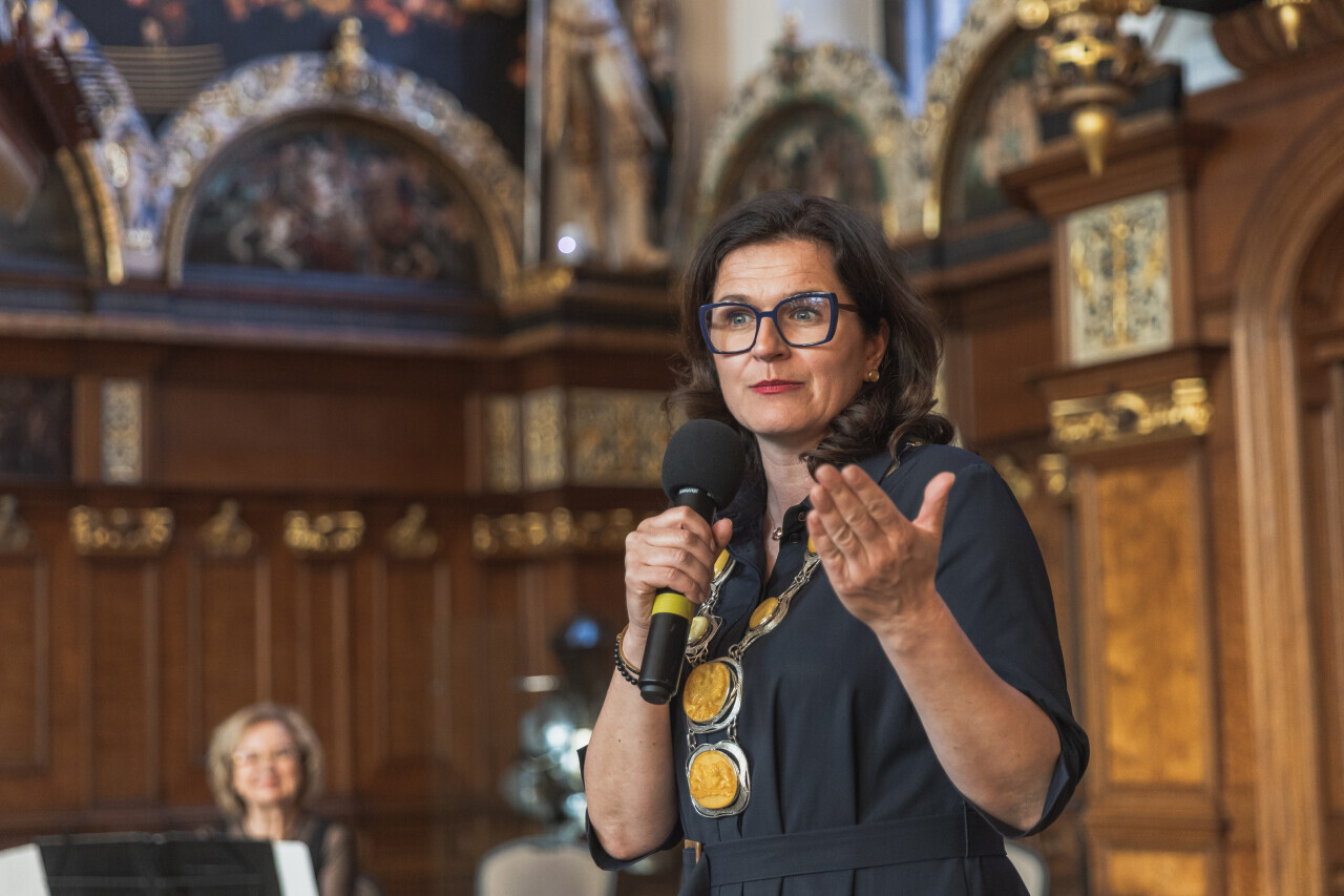 Gdańsk. Dwór Artusa. Jubileusz Par Małżeńskich - Złote Gody, podczas których Prezydent Gdańska Aleksandra Dulkiewicz wręczyła medale za długoletnie pożycie małżeńskie