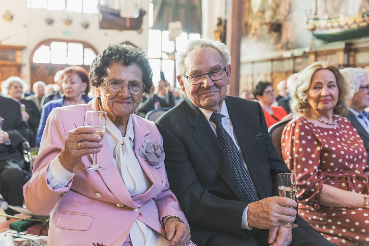 Gdańsk. Dwór Artusa. Jubileusz Par Małżeńskich - Złote Gody, podczas których Prezydent Gdańska Aleksandra Dulkiewicz wręczyła medale za długoletnie pożycie małżeńskie