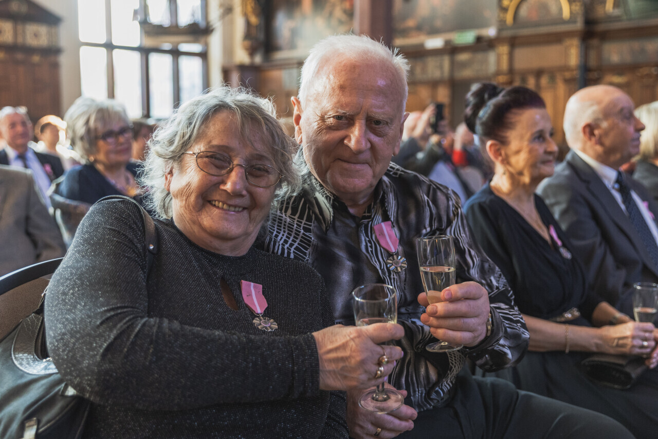 Gdańsk. Dwór Artusa. Jubileusz Par Małżeńskich - Złote Gody, podczas których Prezydent Gdańska Aleksandra Dulkiewicz wręczyła medale za długoletnie pożycie małżeńskie