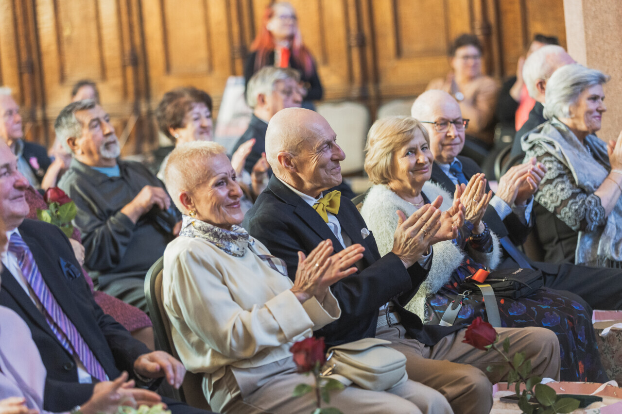 Gdańsk. Dwór Artusa. Jubileusz Par Małżeńskich - Złote Gody, podczas których Prezydent Gdańska Aleksandra Dulkiewicz wręczyła medale za długoletnie pożycie małżeńskie