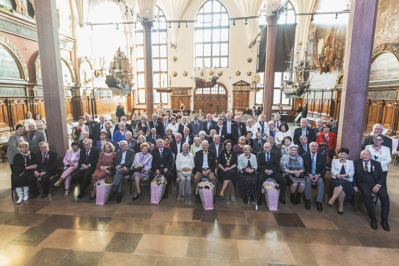 Gdańsk. Dwór Artusa. Jubileusz Par Małżeńskich - Złote Gody, podczas których Prezydent Gdańska Aleksandra Dulkiewicz wręczyła medale za długoletnie pożycie małżeńskie