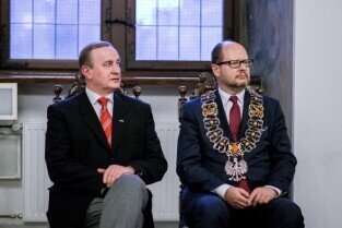 Gdańsk, Ratusz Głównego Miasta. Jubileusz Par Małżeńskich - "Złote Gody", podczas których Prezydent Gdańska Paweł Adamowicz wręczył medale za długoletnie pożycie małżeńskie. Nz Grzegorz Graefling z Urzędu Stanu Cywilnego i Prezydent Gdańska, Paweł Adamowicz.