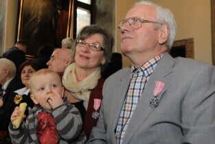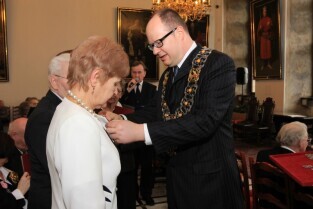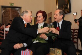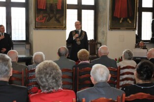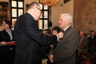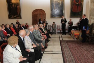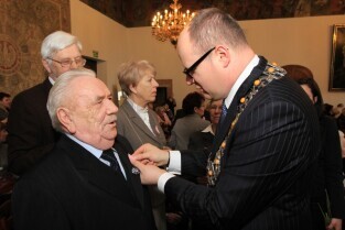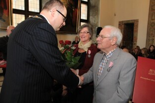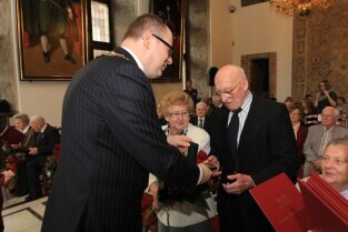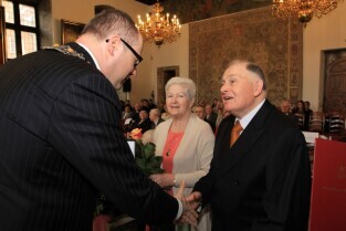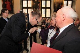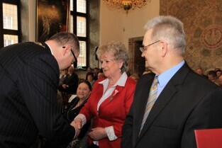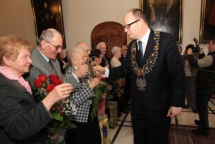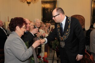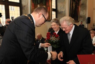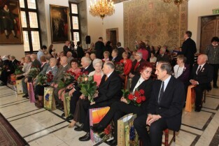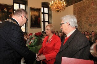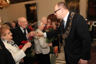 Uroczystość, podczas której Prezydent Gdańska Paweł Adamowicz wręczył pamiątkowe medale przyznawane przez Prezydenta RP oraz Prezydenta Miasta Gdańska za długoletnie pożycie małżeńskie. Gdańsk, Ratusz Głównomiejski.
