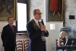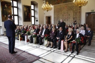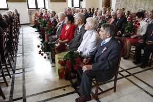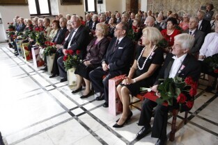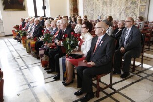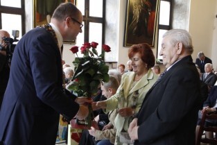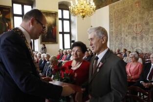 Gdańsk, Ratusz Głównomiejski. Uroczystości jubileuszowe par małżeńskich. Jubilatów okolicznościowymi medalami odznaczył prezydent Gdańska Paweł Adamowicz.