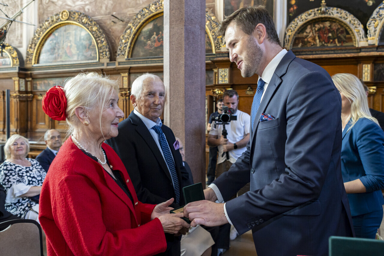 Gdańsk. Piotr Grzelak, Zastępca prezydent Gdańska ds. zrównoważonego rozwoju i gospodarki, wręczył medale za długoletnie pożycie małżeńskie 35 parom, podczas uroczystości, która tradycyjnie odbyła się w zabytkowych wnętrzach Dworu Artusa.