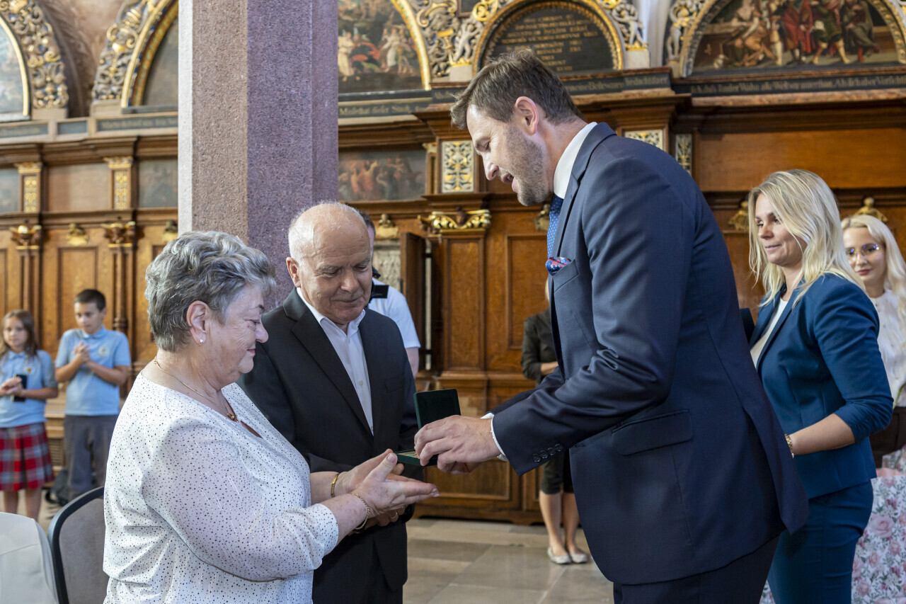 Gdańsk. Piotr Grzelak, Zastępca prezydent Gdańska ds. zrównoważonego rozwoju i gospodarki, wręczył medale za długoletnie pożycie małżeńskie 35 parom, podczas uroczystości, która tradycyjnie odbyła się w zabytkowych wnętrzach Dworu Artusa.