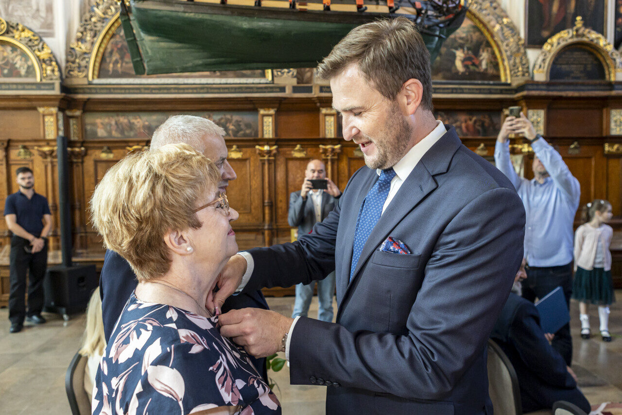 Gdańsk. Piotr Grzelak, Zastępca prezydent Gdańska ds. zrównoważonego rozwoju i gospodarki, wręczył medale za długoletnie pożycie małżeńskie 35 parom, podczas uroczystości, która tradycyjnie odbyła się w zabytkowych wnętrzach Dworu Artusa.